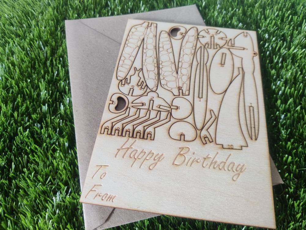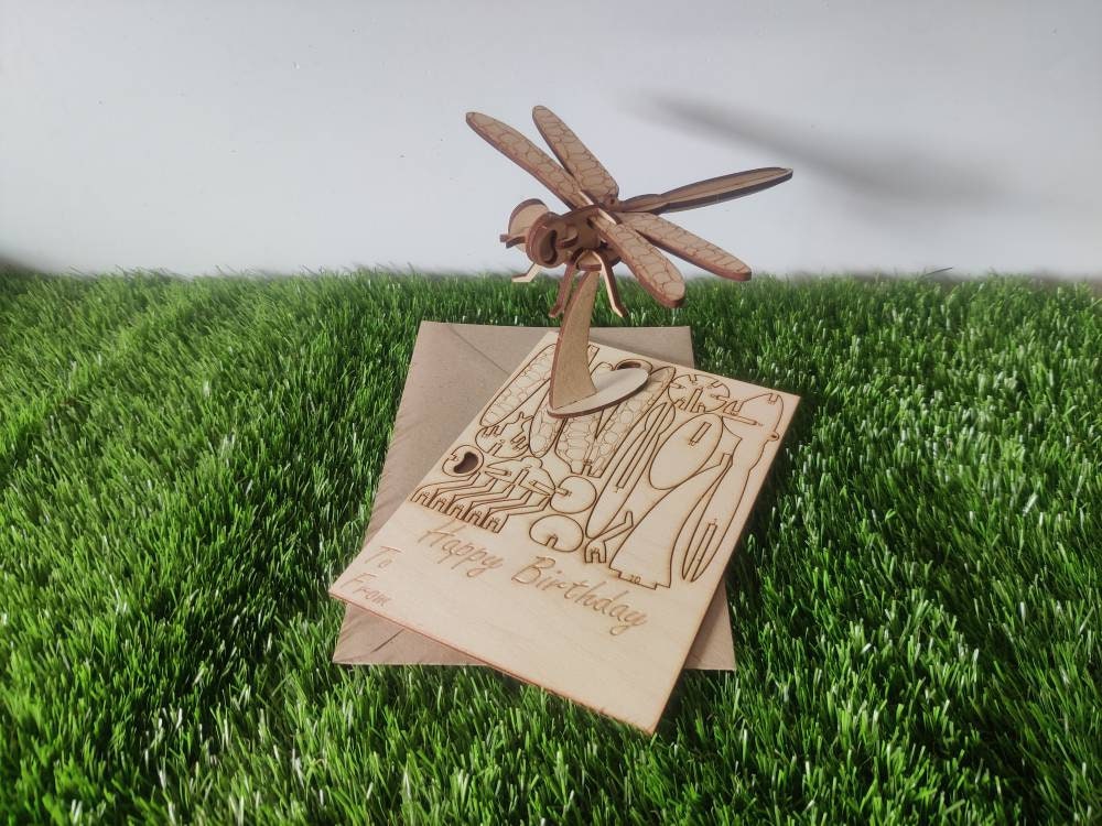 Why give a plain simple card when you can give a model card? This card is made of 3mm plywood and when pushed out and built turns in to a Dragonfly model that stands 180mm wide and 120mm (when on its stand).